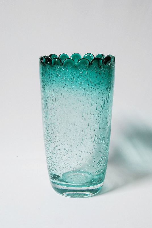 Kauni helesinise tooniga suur vaas Sammal, toodetud 1980. aastatel tehases Tarbeklaas, autor Tiia-Lena Vilde.