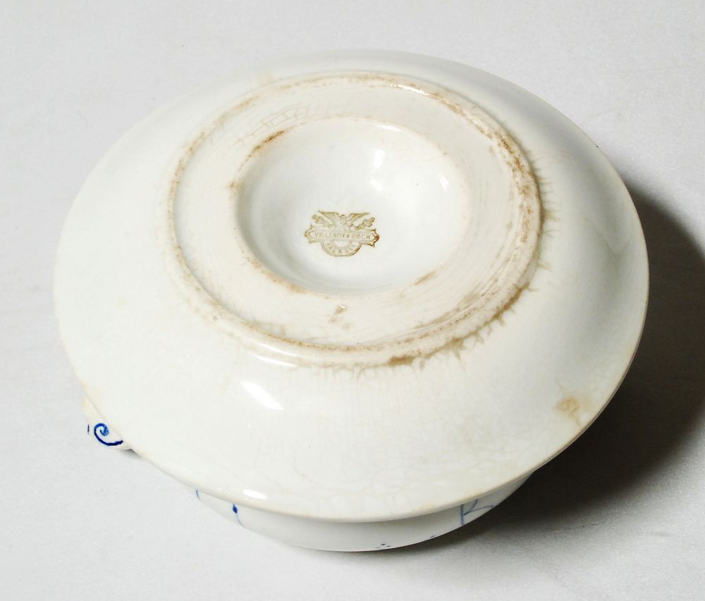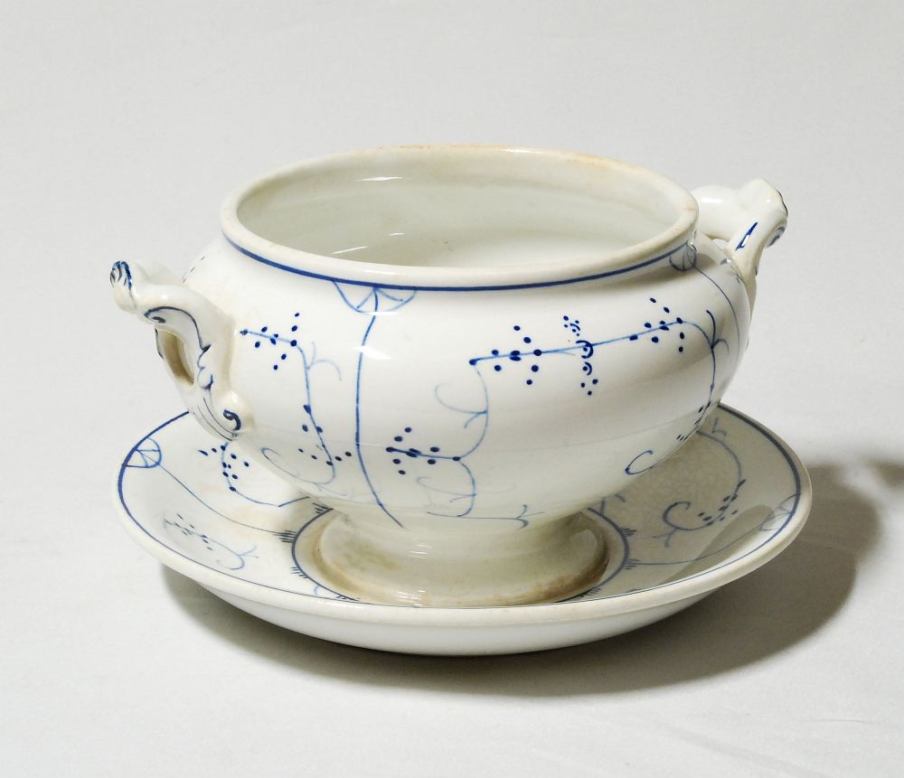 Klassikalise sinise dekooriga sajandivanune väiksem serveerimisnõu kastmele vms. Esemel esineb vanusest tingitult krakleed ja pruune laike.